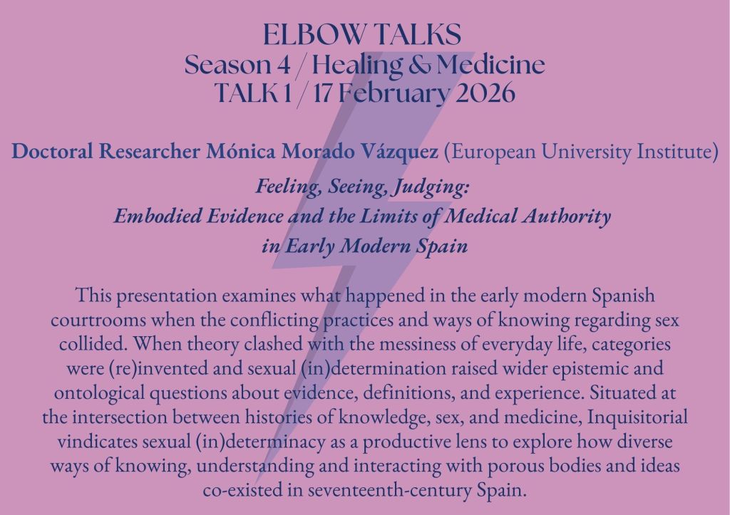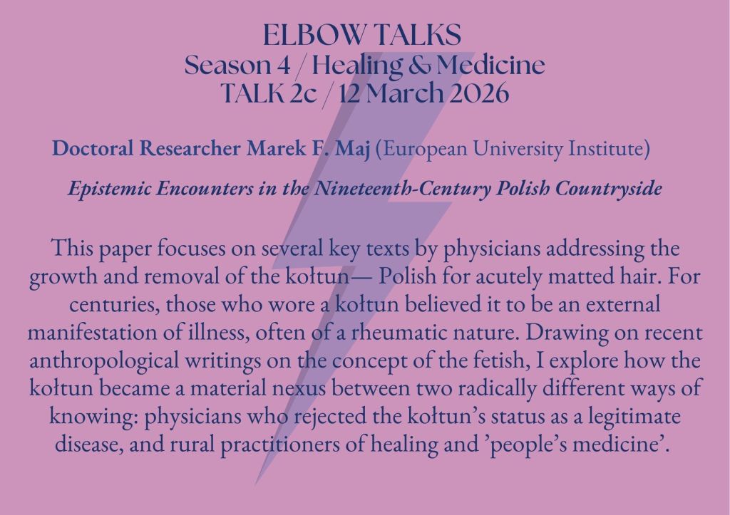 The fourth season of ELBOW Talks investigates marginal and experimental forms of healing and medicine in many curious ways. We discuss conflicting practices in defining one’s sex in early modern Spain; the relation between unicorns and science in early modern Russia; the role of sympathy in treating patients in 19th century Britain; the cultural meanings of matted hair in 19th century Poland; female surgeons and their patients in early modern Germany; and medicating a life-threatening condition.